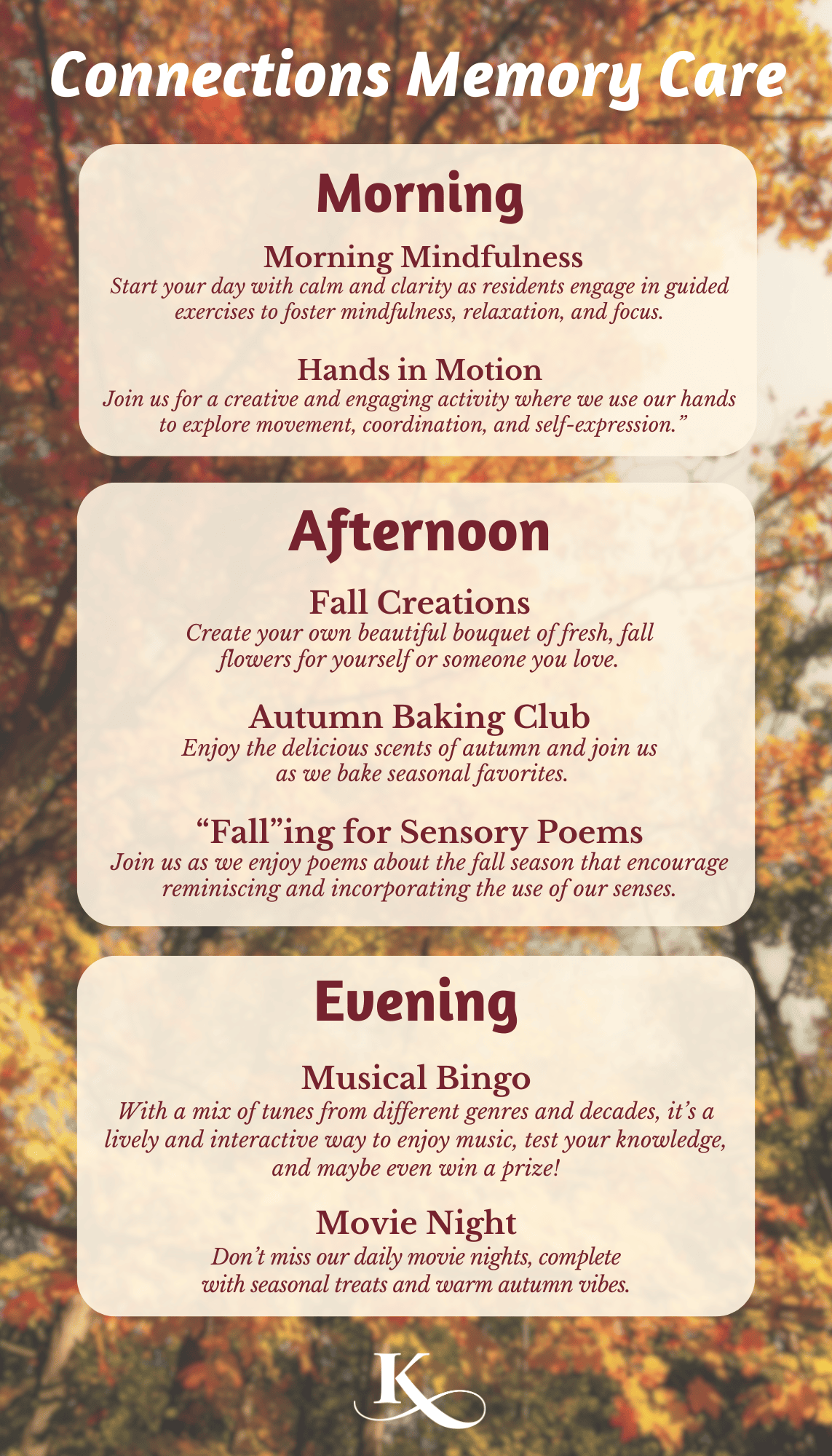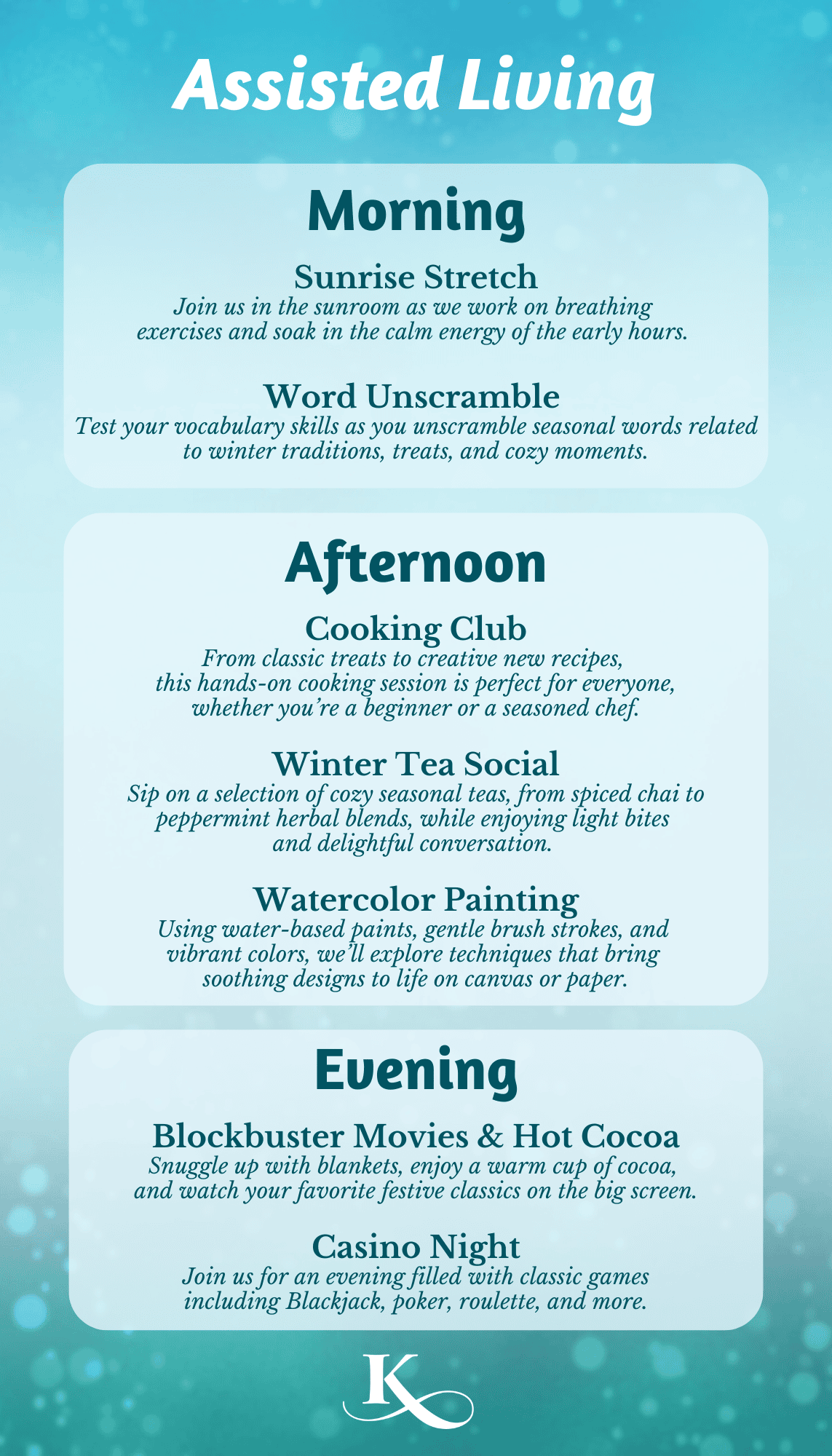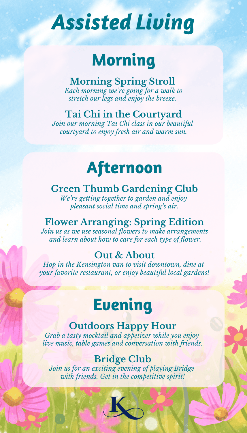 Activities and friendships have been shown to reduce stress, preserve wellness, keep the mind sharp and increase feelings of worth, especially for seniors. So, we are always searching for new ways to stimulate the mind, strengthen the body, nourish the spirit.